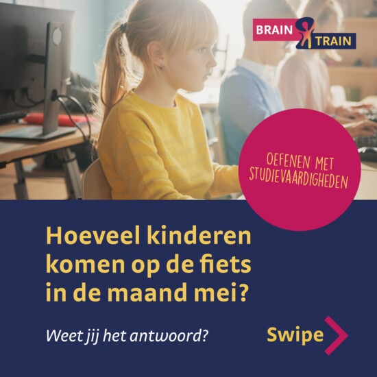 ‘Hoeveel kinderen komen op de fiets in de maand mei?’ Deze vraag moeten de leerlingen beantwoorden in Brain2Train studievaardigheden. In dit online oefenprogramma trainen leerlingen om studievaardigheden in te zetten bij het gebruik van informatiebronnen, zoals tabellen, grafieken, kaarten en schema’s. De leerlingen gaan zelfstandig aan de slag met Brain2Train, dus het kost geen extra onderwijstijd voor de leerkracht. Ideaal…