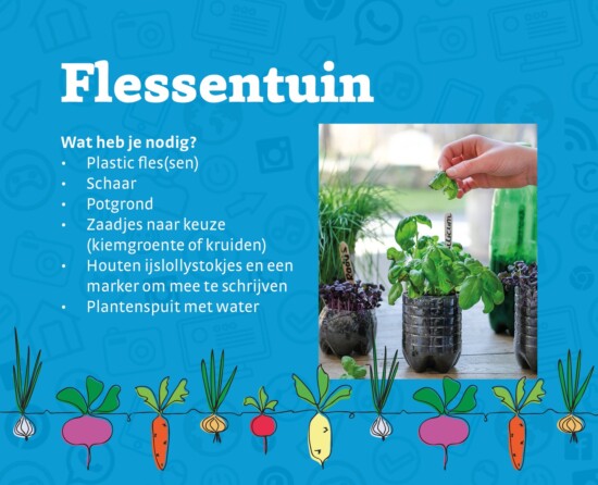 F L E S S E N T U I N Plastic, het is overal om ons heen. Ook al scheiden we afval, er belandt veel in de natuur. Gebruikte plastic flessen kan je recyclen tot iets leuks en bruikbaars. Maak er bijvoorbeeld een flessentuintje van. De plastic flessen werken als een soort mini-kasje. Zet er een paar bij elkaar…